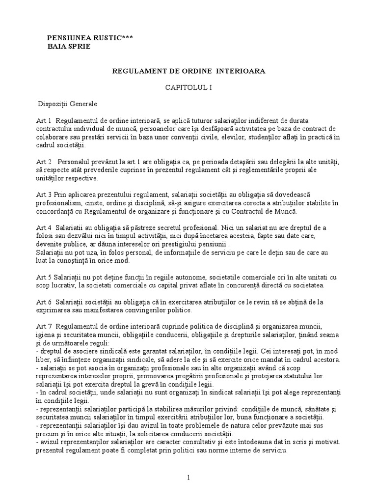 Regulament Intern Source from : https://ro.scribd.com/document/53129910/regulament-intern Ministerul educației nu a transmis și nu va transmite către unitățile și instituțiile de învățământ nicio interdicție expresă cu privire la oferirea de flori și mărțișoare. Regulamentul de ordine interioară se aplică 1. Regulamentul de ordine interioară capitolul i. Regulamentul de ordine interioara si normele de comportament prezentate mai jos au rolul de a stabili premizele functionarii in conditii civilizate si conform normelor legale. Copyright holders please send me an email and i will remove the track if.