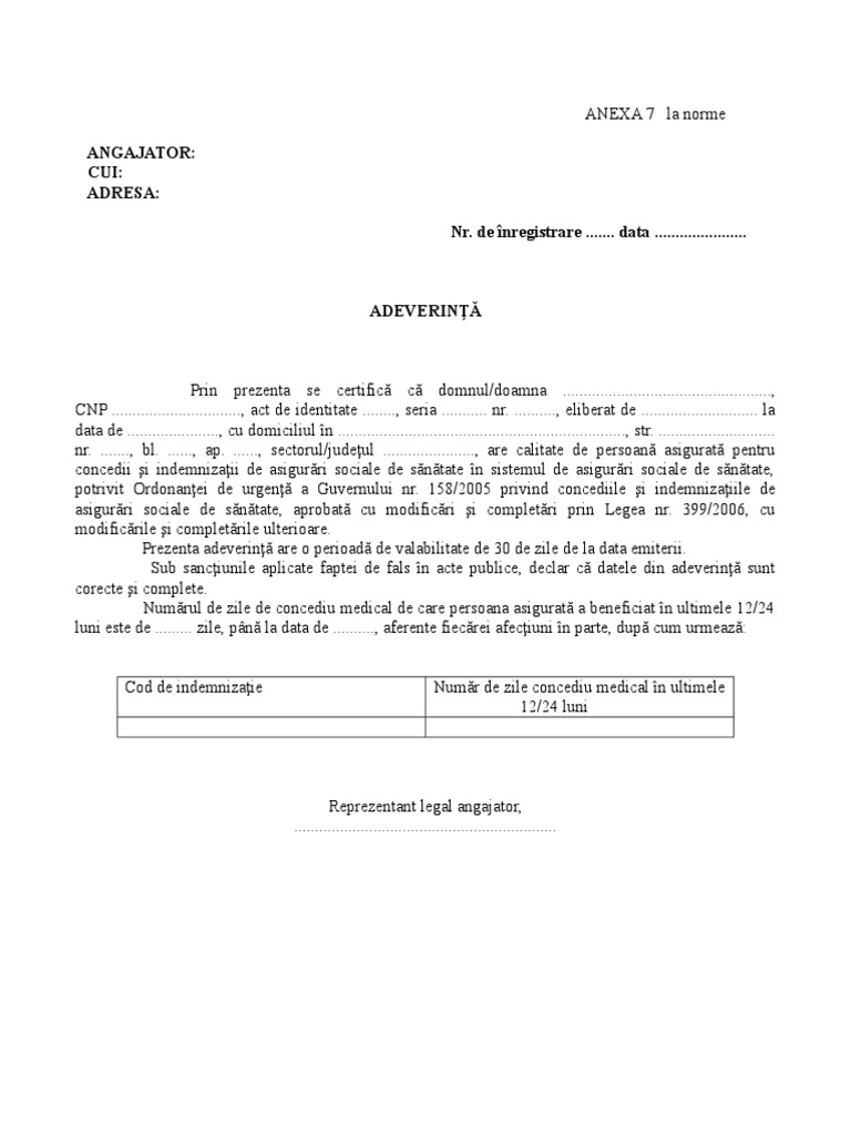 vizitati articolul complet aici : https://www.cabinetexpert.ro/2020-01-14/adeverinta-medic-coasigurat-2020-model-util-pentru-toti-colegii.html Aceasta adeverinta este eliberata de angajator in original si face dovada ca angajatul este asigurat in sistemul national de sanatate, acestuia i se se mentioneaza daca asiguratul a mai beneficiat sau nu de concediu medical, pentru ca zilele de internare sunt de maxim 183 pe an, restul sunt nedecontate. Concedii medicale si indemnizatii de risc maternal. Pentru a putea beneficia de indemnizatie pentru concediul medical in functie de codul mentionat de medic pe certificatul medical se va stabili tipul de concediu medical si pentru ca un salariat sa primeasca concediu medical, trebuie sa fi fost.