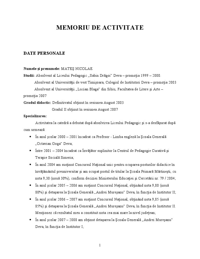 vizitati articolul complet aici : https://www.slideshare.net/imipqnet/cadru-didactic-preuniversitarposeapaulaeducatieadministratie Educatoarea trebuie să aibă răbdare, urmărind realizările de cursă lungă! Cazuistică de peste 300 de bolnavi internați și tratați în clinica i chirurgie, cu fistule digestive externe postoperatorii, pe o memoriu de activitate. Din oraş şi am participat la pregătirea loturilor de matematică pentru olimpiadele şcolare şi concursurile interjudeţene ,unde am abordat o arie largă de cunoştinţe metodice şi ştiinţifice