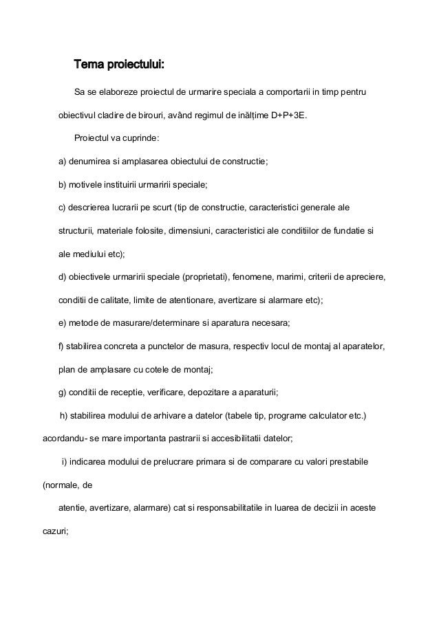6.3 instructiuni privind urmarirea comportarii in timp a constructiei. Ne caracterizam prin profesionalism, atentie la detalii, corectitudine fata de clienti si o munca prestatata in conformitate cu legile in vigoare. Urmărirea curentă a comportării în exploatare a construcțiilor este o acțiune sistematică de observare, examinare, investigare a modului în care răspund sau reacționează construcțiile în decursul utilizării lor, sub influența agenților de.